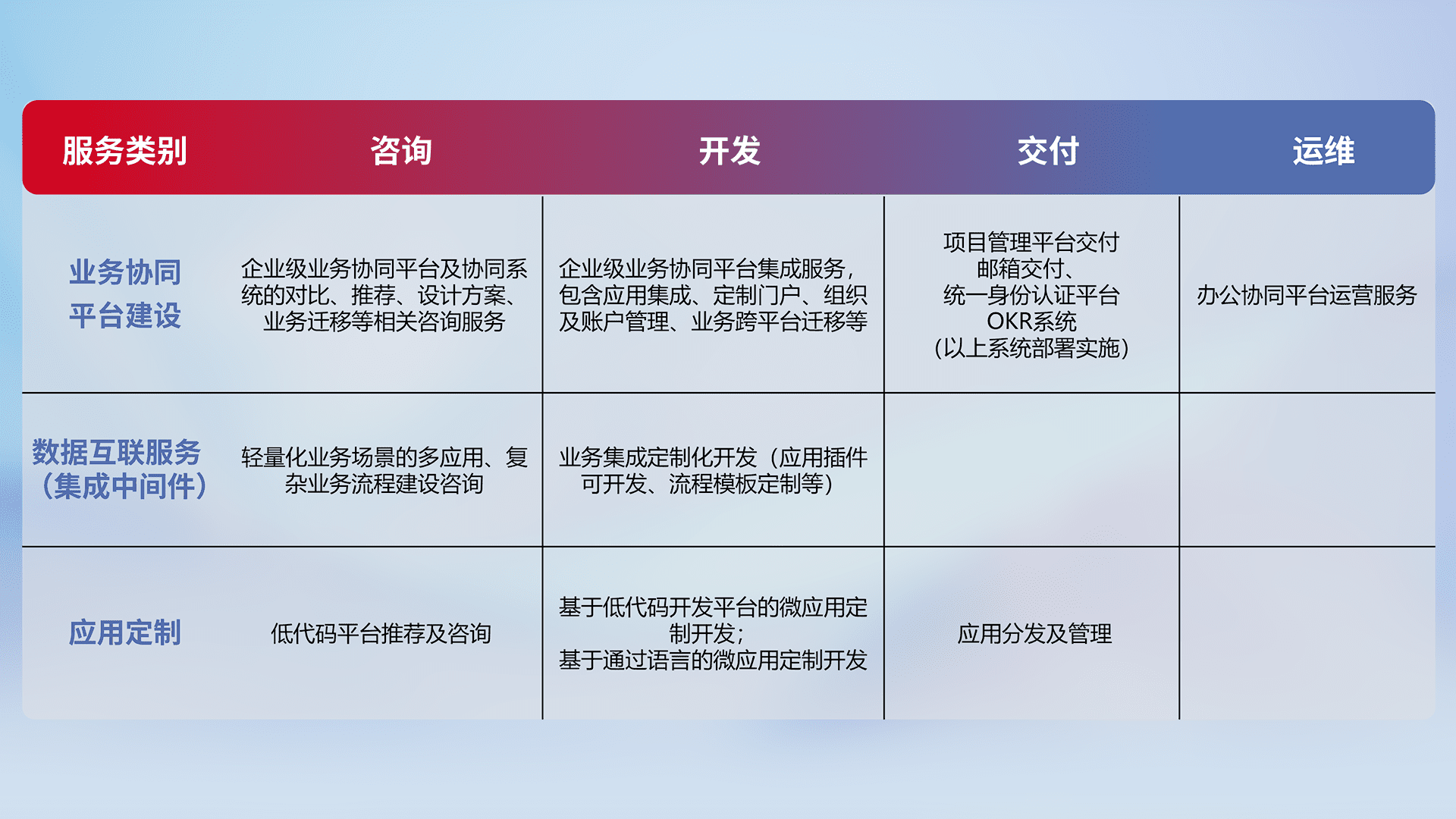 针对钉钉、、、、企微、、、、IDaas等平台级产品提供产品的规划、、、、方案、、交付、、、、定制化开发等服务,,,实现如统一协同办公、、、、智能客户服务、、混合会议管理、、智能数据查询、、等业务场景,,,实现数字化转型。。